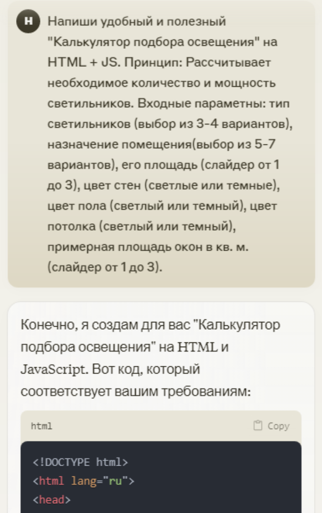 Пример промпта по созданию калькулятора: Напиши удобный и полезный "Калькулятор освещения" на HTML + JS. Принцип: Рассчитывает необходимое количество и мощность светильников. Входные параметры: тип светильников (выбор из 3-4 вариантов), назначение помещения(выбор из 5-7 вариантов), его площадь (слайдер от 1 до 3), цвет стен (светлые или темные), цвет пола (светлый или темный), цвет потолка (светлый или темный), примерная площадь окон в кв. м. (слайдер от 1 до 3).