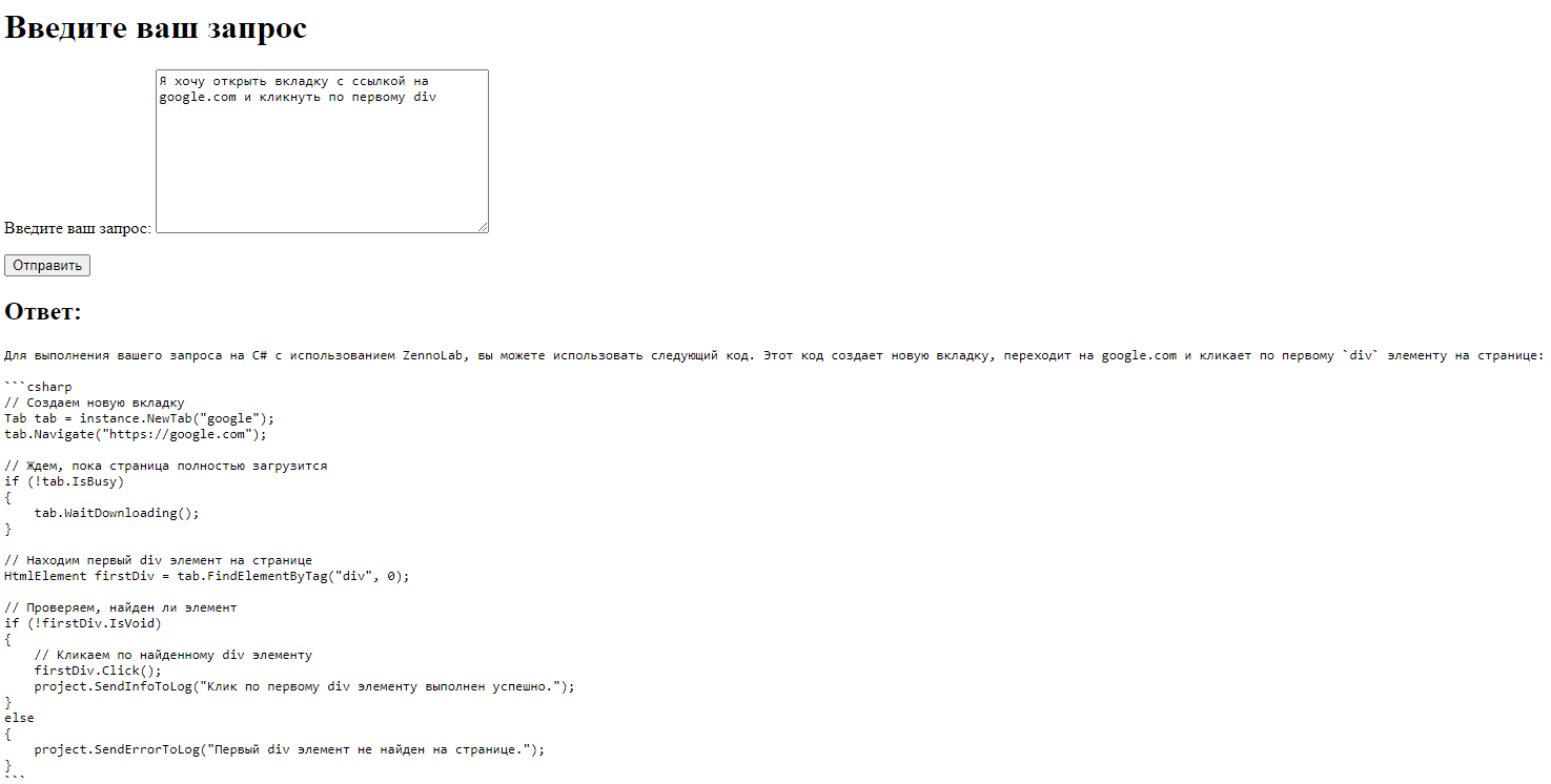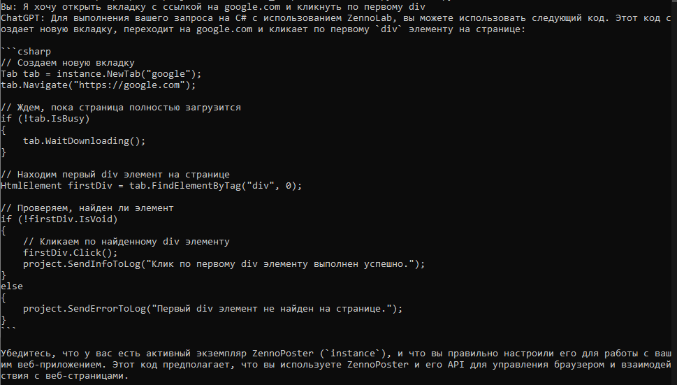 Чат-бот, который поможет написать сниппеты на C# для ZennoPoster или ZennoDroid. Я предусмотрел два варианта взаимодействия с ботом: через консоль и через веб. Чат-бота можно развернуть, как у себя на компьютере, так и на машине с Linux.