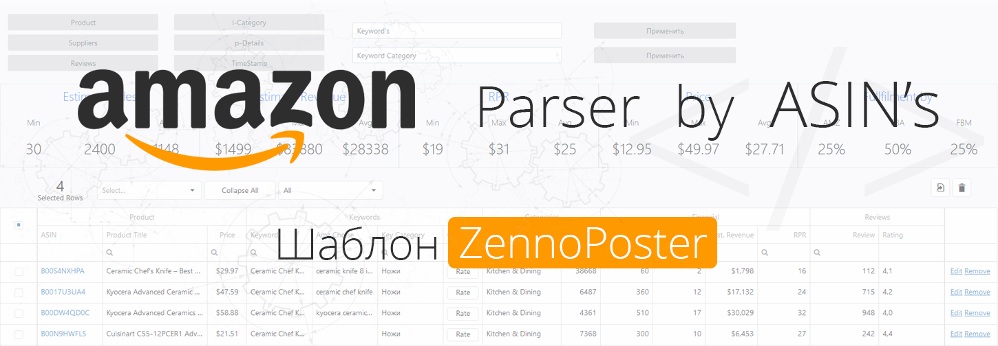 - Автоматический расчет финансовых показателей Min, Max, Avg - для Estimate Sales, Estimate Revenue, RPR, Price. А также процентное соотношение Fullfilment by для AMZ, FBA, FBM.