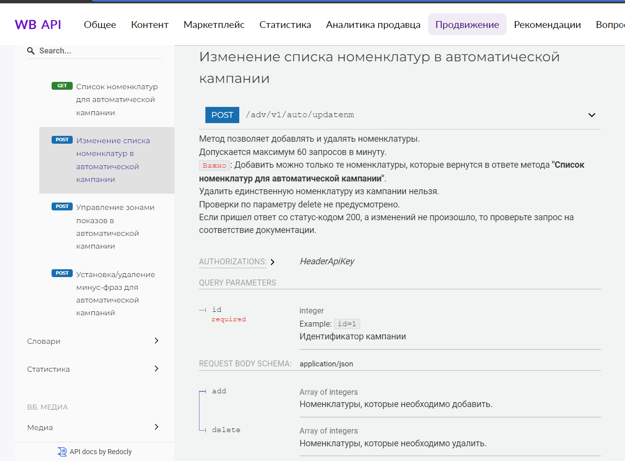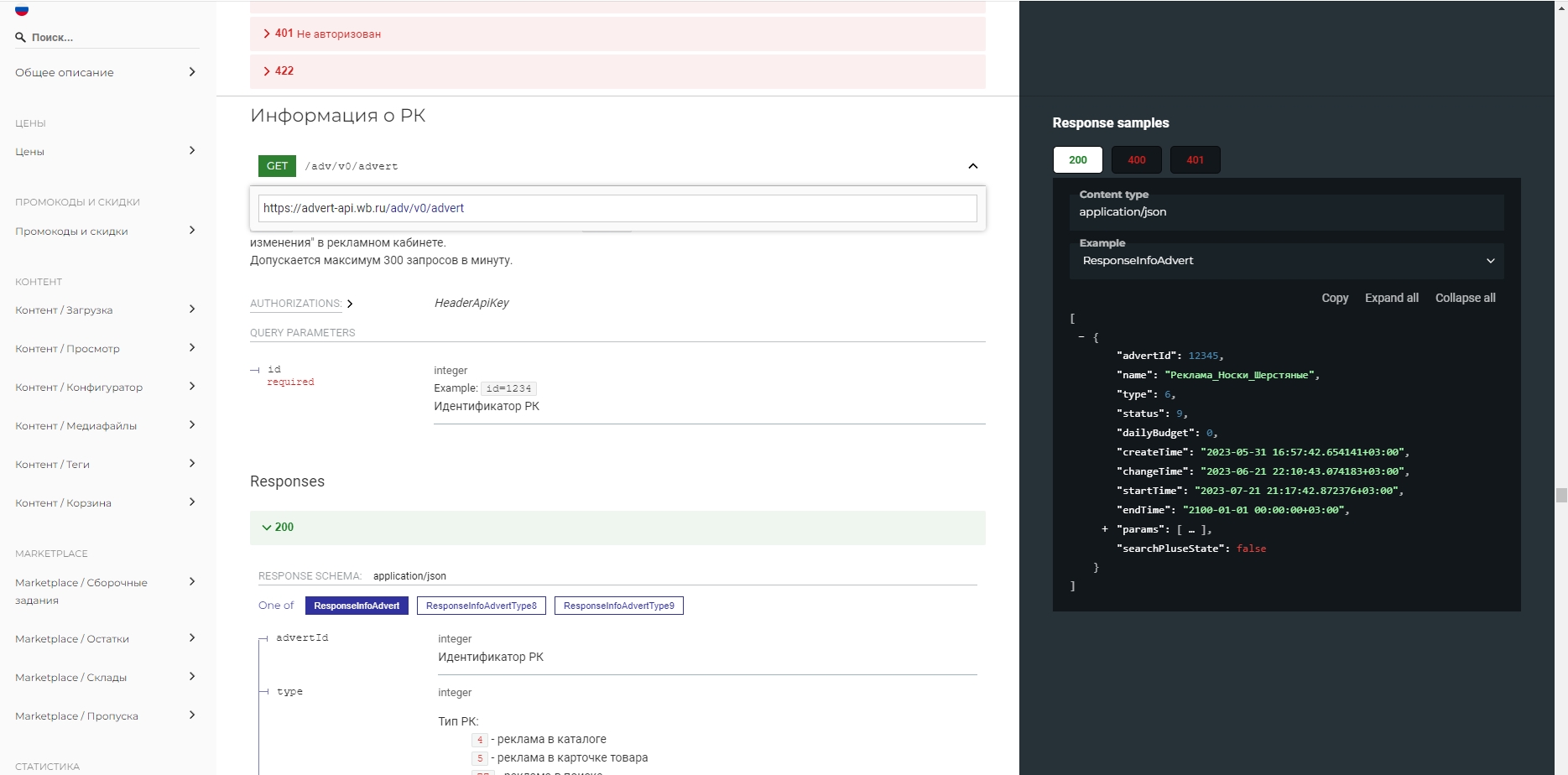 Пробую работать с API от Wildberries: https://openapi.wildberries.ru/#tag/Reklama/paths/~1adv~1v0~1adverts/get