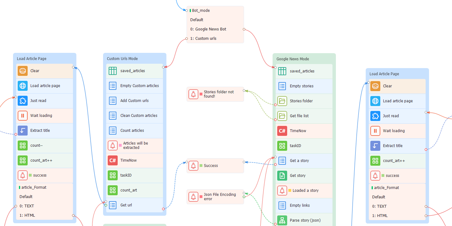 - Google News Mode: This mode is specifically designed to handle Google News articles. The template loads JSON files that were previously generated by another ZennoPoster template, which parses Google News stories (focusing on top news). The JSON files are then processed one by one, with each article being extracted and saved in the desired format.