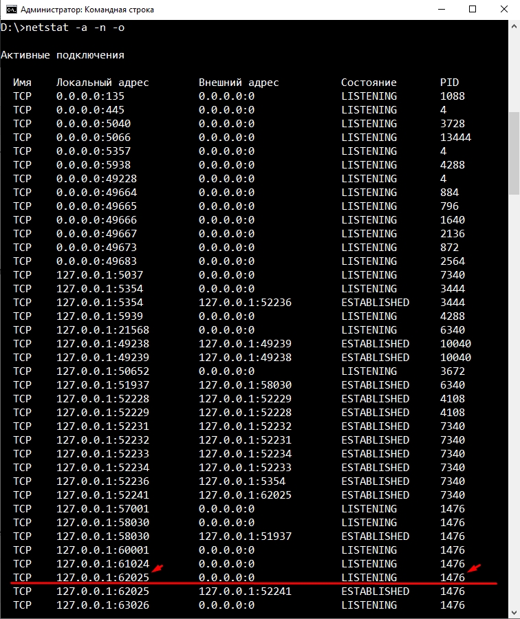 то высветится множество адресов, а в самой правой колонке мы увидем pid.