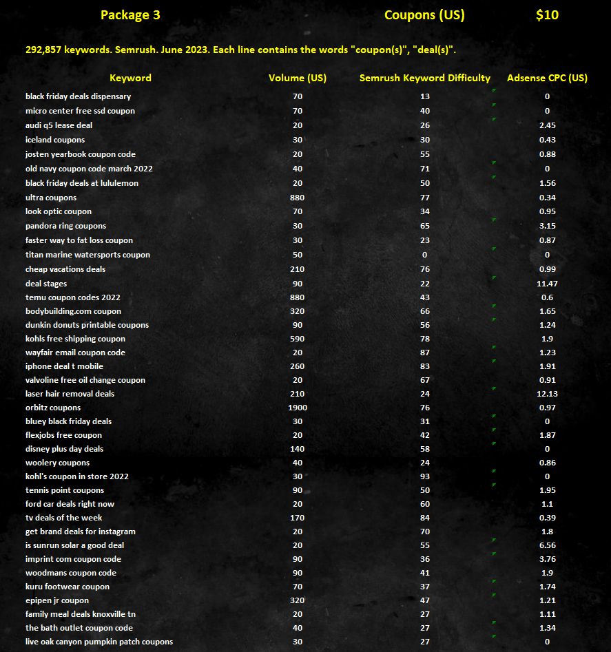 Coupons (US) - 292,857 кейвордов. United States. Semrush. Июнь 2023. В каждой строчке есть слова "coupon(s)", "deal(s)". Semrush Volume (среднее кол-во поисков ключевого слова в месяц), Semrush Keyword Difficulty (конкуренция по ключевому слову), Adsense Cost-per-click (если есть). Цена - $10