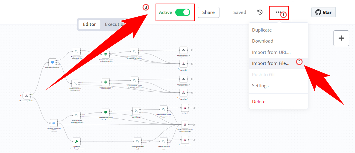 Импортируем рабочий процесс в n8n (есть в приложеном архиве).