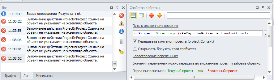 Доброго времени. Зенка версии 5.10.4.1. У меня при попытке выполнить "Проект в проекте" шаблон "ReCaptchaGnizer.xmlz" завершается с ошибкой. В логе пишет ссылка на объект не указывает на экземпляр объекта. Как можно исправить подскажите пожалуйста.