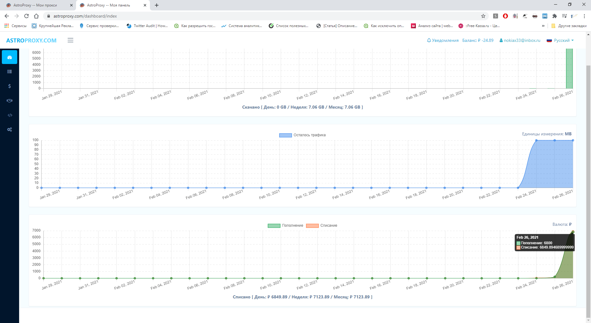 Решил залить немного денег чтобы протестировать как они ведут себя в действия. В порядке до 200 рублей , взял на пробу сначала по 1 резидентский потом ещё 4 и вижу что в принципе нормально но из-за невнимательности не настроил правильную смену Ip и сожрал весь трафик за пару минут.
