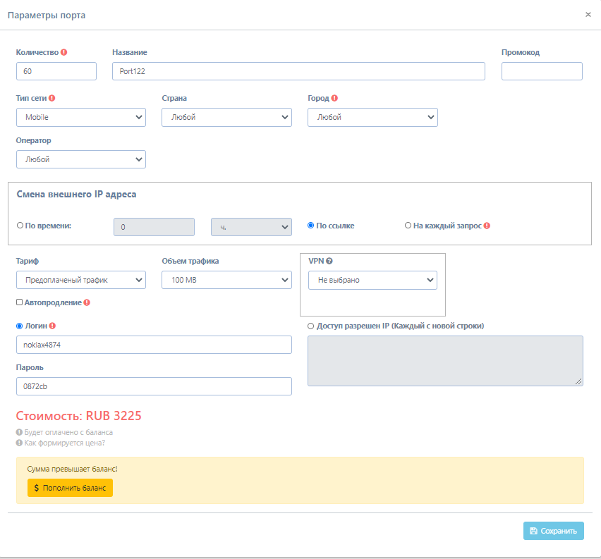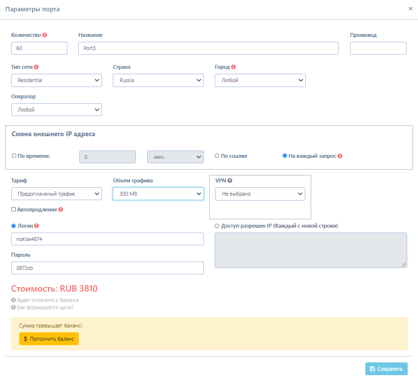 Подсчитал что +- 1 мегабайт выйдет +- 0,3 рубля это для моих задач в принципе устраивает с ротацией IP по запросу, решил залить денег с учетом всех нужных мне процессов +- нужно было залить 6800 рублей , приобрел 120 портов.