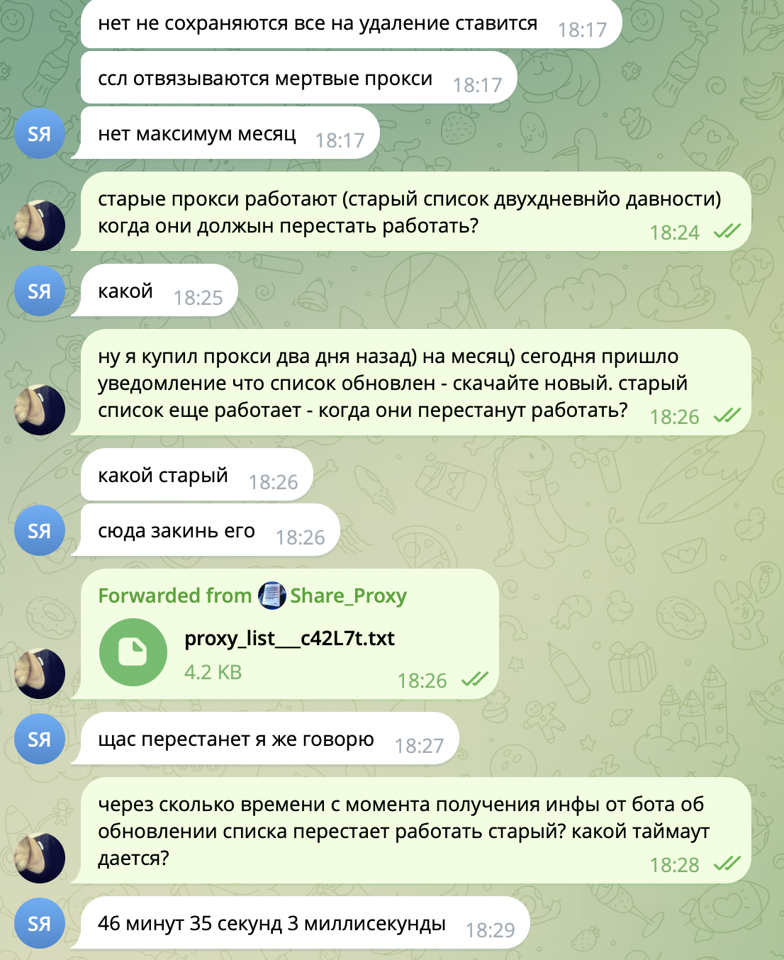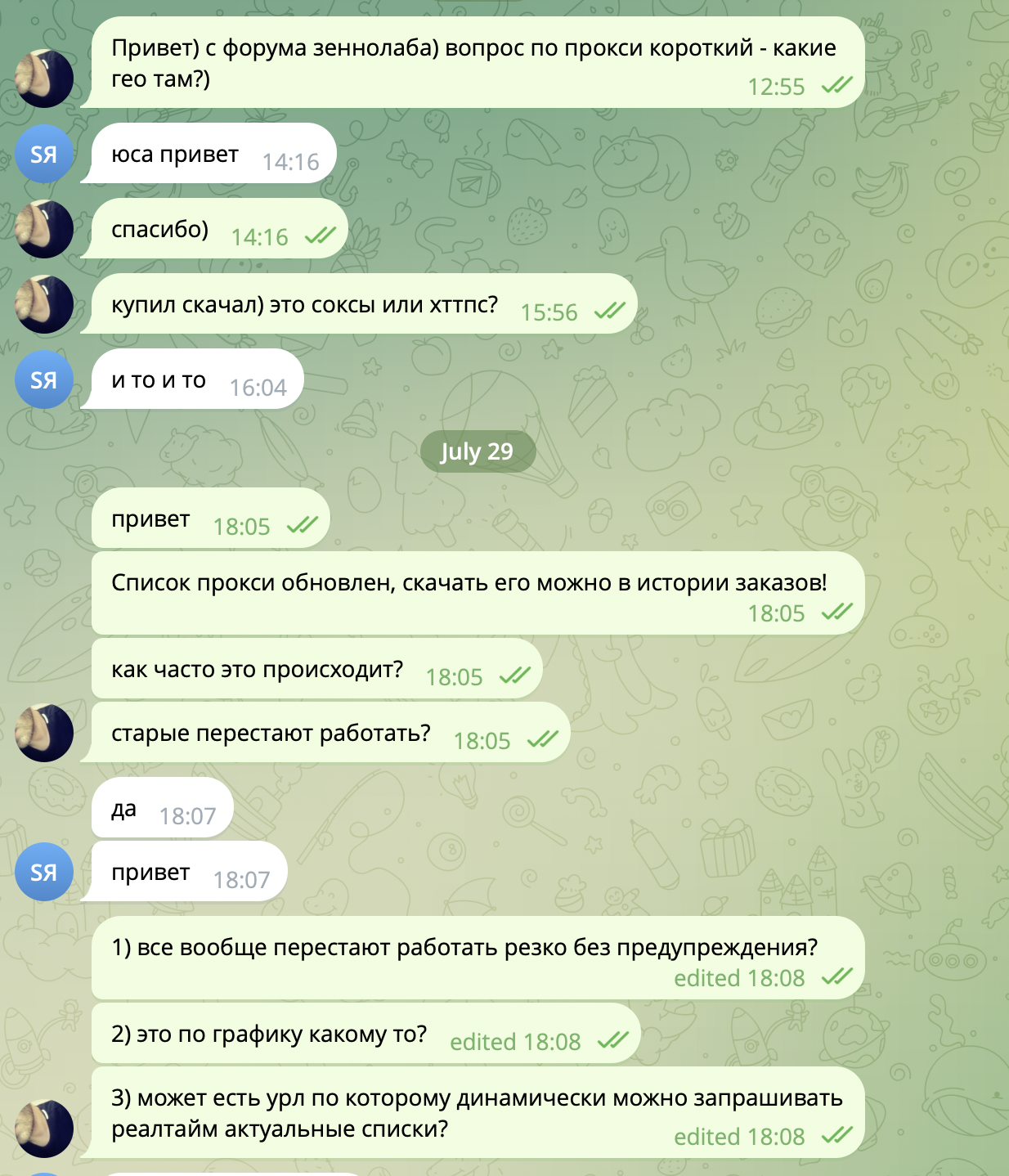 ну да, и не довольным конечно же продолжать пользоваться прокси =) Пулл меняется раз в неделю у нас, люди получают свежие новые, не дохлые прокси, это же хорошо. а то что над тобой пошутили, так у нас не сервис где сидят дяди в костюмах и тебя поливают вином только бы ты продлил подписку и купил прокси по овер прайсу =) По отзывам, у нас поток клиентов большой, живой траффик, это наоборот хорошо, что люди оставляют отзывы, у них на других форумах репутация большая, к сожалению, на зенно не все есть =)Посмотреть вложение 135090Посмотреть вложение 135091Посмотреть вложение 135093