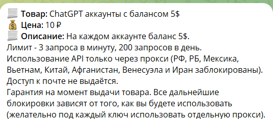 Ежедневно в наличии OpenAI / ChatGPT с балансом 5$ + API по цене 6р аккаунт опт 1000 штук по цене 5р аккаунт Формат login:pas:api Андрей You can contact @inst_perv right away. t.me