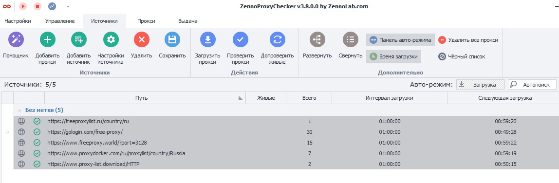 ZennoProxyChecker 3.8.0.0. Если включить автопоиск, то много битых источников и живые прокси долго не находятся.