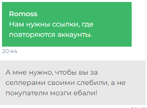 НЕ РЕКОМЕНДУЮ ПОКУПАТЬ ЧТО ЛИБО ТУТ,ЕСЛИ У ВАС НЕ ИСТЫКАНА ВСЯ КОМНАТА КАМЕРАМИ И НЕ ВЕДЕТЕ ЗАПИСЬ 24/7 РАБОЧЕГО СТОЛА. Купил 15 акков ТГ,включил запись,записал каждый акк как чекал,написал в тп,сказали что нужно было снимать с момента захода,покупки,на голове,держась одной рукой за батарею,второй за плечо.На видео четко видно что прошло 5 минут с момента покупки (что достаточно что бы подготовить к записи)И что логично что физически я бы их не смог проверить за эти 5 минут .Из 15 акков (2 валид и то уже использованы) Видео - https://drive.google.com/file/d/1RRepICAabme1YATZUMuplq0hB9i5Ru_d/view?usp=sharing и https://drive.google.com/file/d/1IcbUFPAnX9kNm7jK7CJMNXn2EA2bNRrI/view?usp=sharing . Переписка с ТП![]()