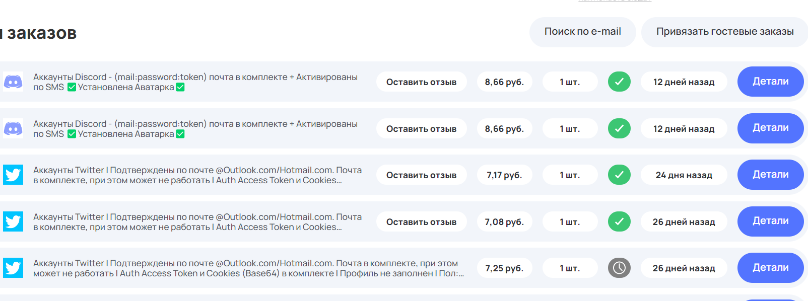 Площадка - дерьмо. Два заказа - две проблемы. В первый раз из 9 аккаунтов дискорда три оказались невалид, решили проблему - но долго и нехотя. Второй заказ - один "ПРЕМИУМ ЭЛИТНЫЙ" аккаунт дискорда, не соответствует описанию. Отлежка две недели у ЭЛИТНОГО аккаунта, лол. Поддержка ничего не делает. Никому не посоветую тут что-либо покупать.