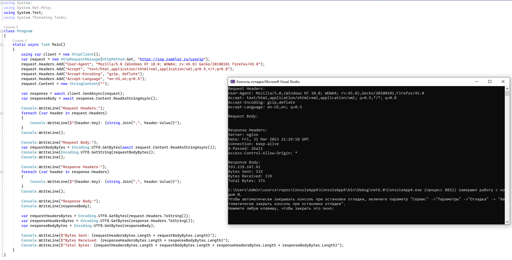Console.WriteLine($"Total Bytes: {requestHeadersBytes.Length + requestBodyBytes.Length + responseHeadersBytes.Length + responseBodyBytes.Length}");