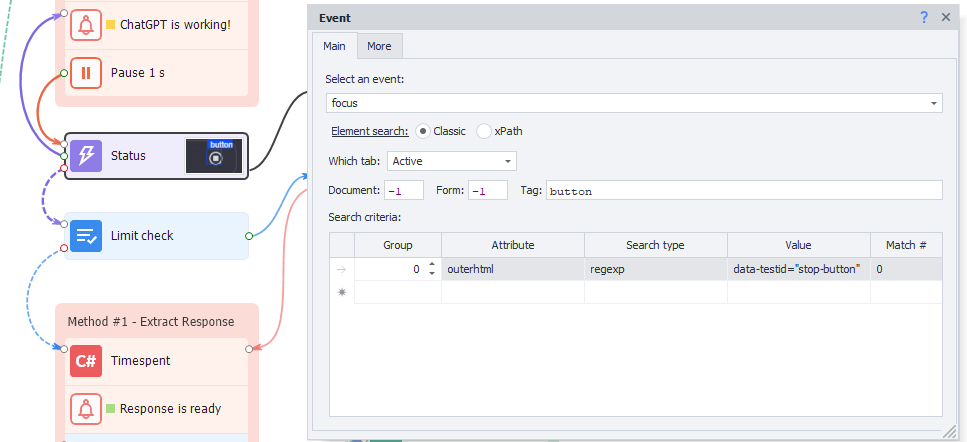 HTML elements that indicate ChatGPT’s status. If the system is busy, the template waits before proceeding, thereby preventing errors, and ensuring smooth operation.