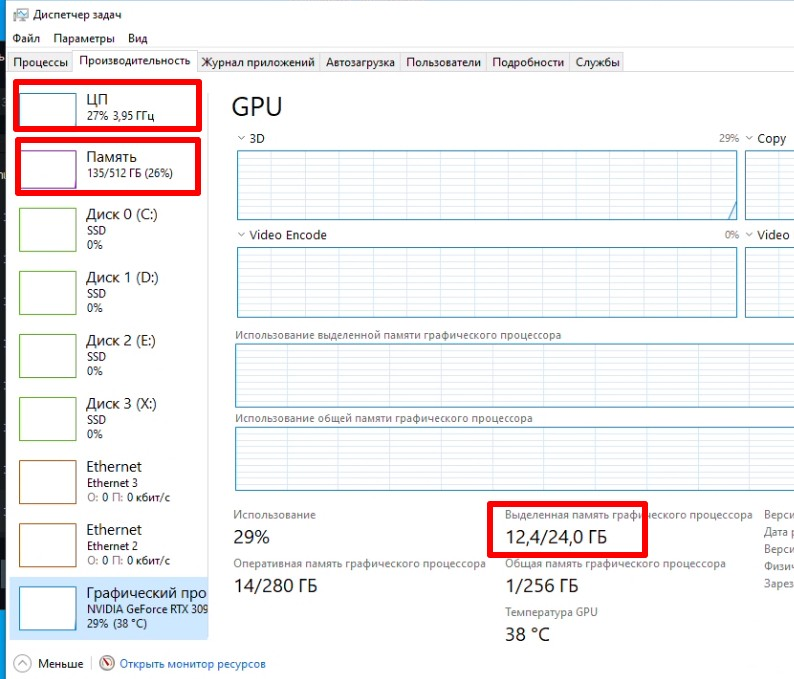 Процессор 90-99%. Оперы 64-70 GB. Видеопамяти 6-8 GB