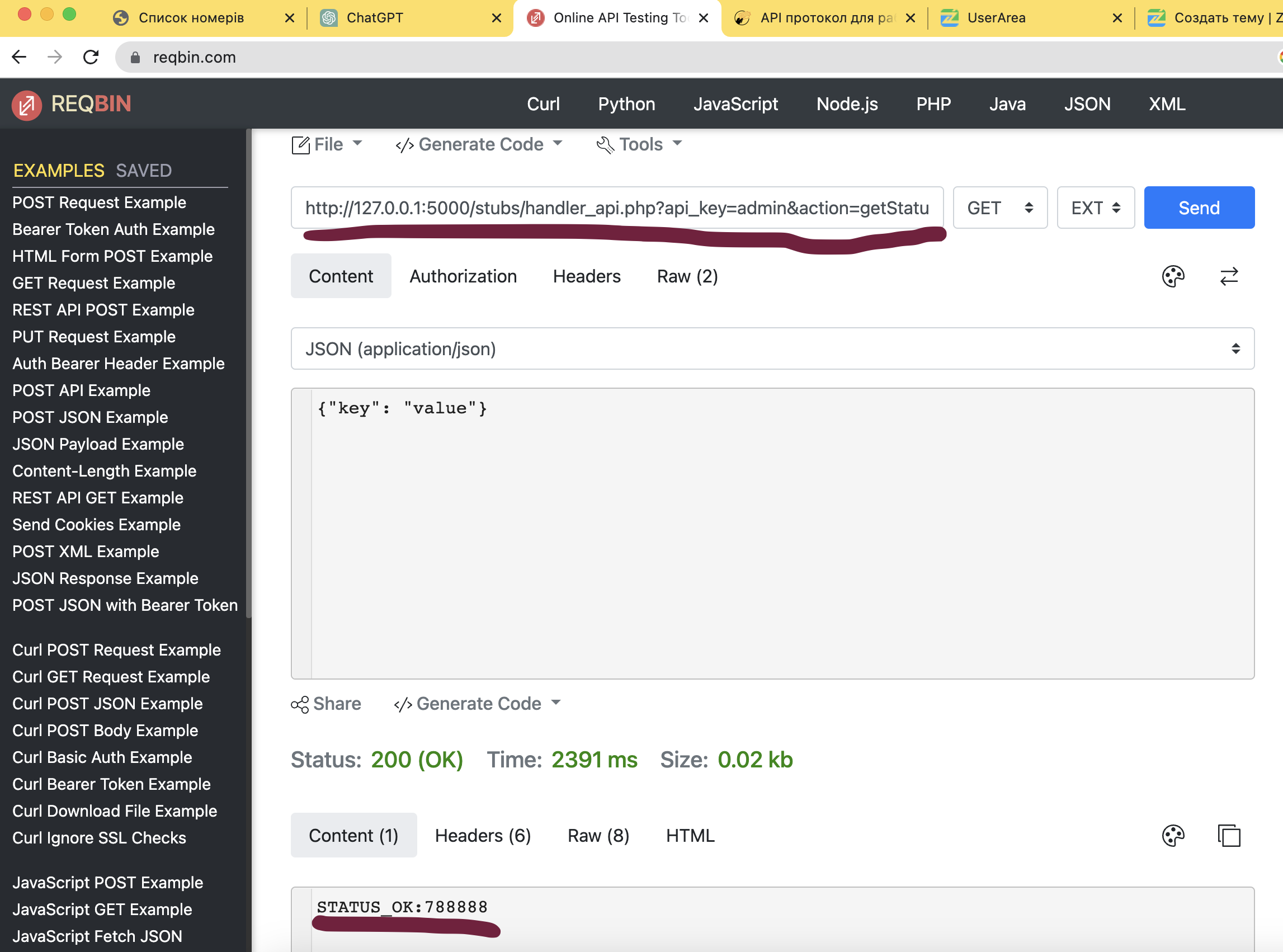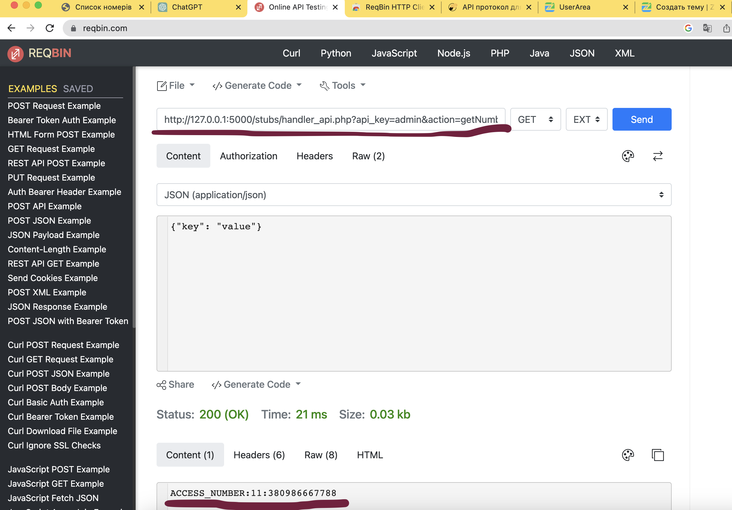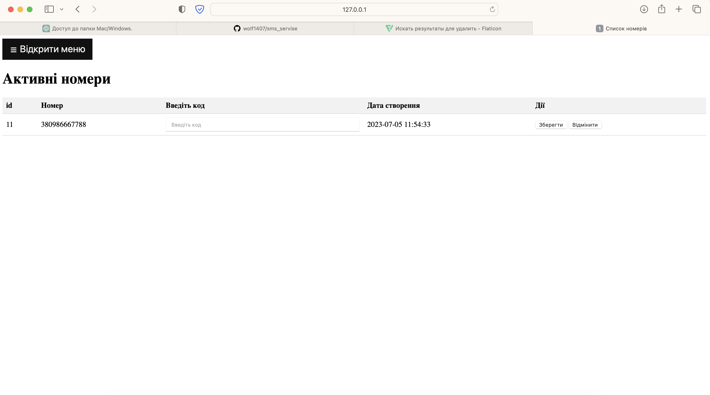 5. Получаем номер по http://127.0.0.1:5000/stubs/handler_api.php?api_key=admin&action=getNumber&country=1