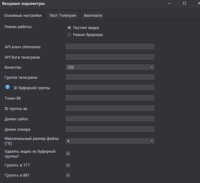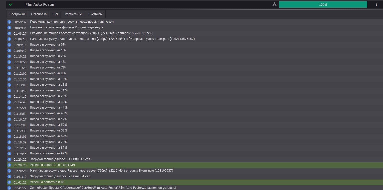 Здравствуйте, друзья! Представляем вам уникальный и мощный шаблон, который изменит ваш опыт скачивания и распространения фильмов на весьма позитивный уровень. С его помощью, вы сможете скачивать любые фильмы в хорошем качестве и напрямую загружать их в группы Telegram и Вконтакте. Волшебный мир кинематографии всегда был и останется непревзойденным источником удовольствия и развлечения, а также источником самого мощного и заинтересованного трафика любых возрастов. Сейчас вы можете стать владельцем собственного шаблона, который будет скачивать фильмы по вашему усмотрению в нужном вам качестве и автоматически распространять их в ваши группы и каналы в Телеграм и Вконтакте, делая ваш контент еще более привлекательным и актуальным, а также максимально освобождает ваше время, с нескольких часов, до десятка минут в неделю.