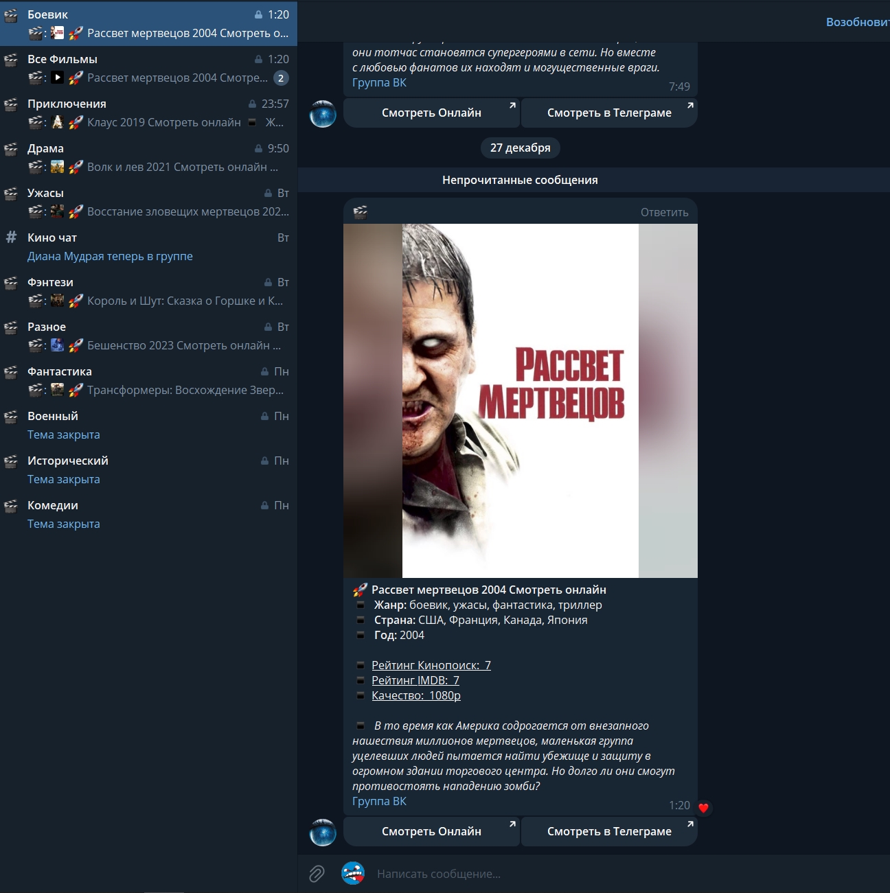 Мощный постинг по категориям (темам) в группе Телеграм (каждая тема, как отдельный канал ТГ по жанрам (триллер, драма, ужасы и т.д.))