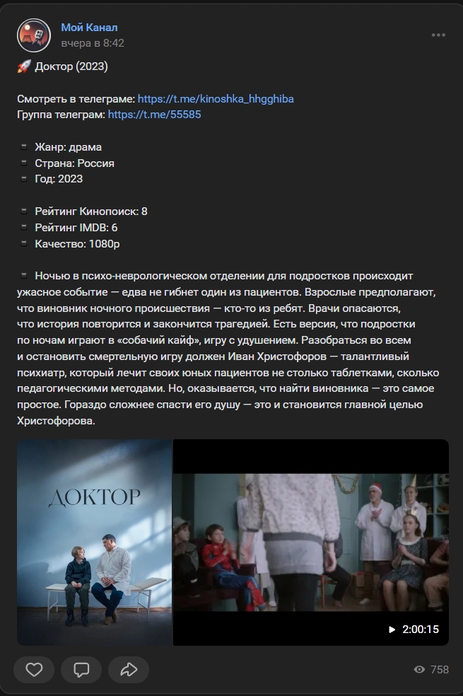 P.S Это не просто шаблон кино, вы можете зарабатывать на рекламе, как в Тлеграм, так и в ВК. Причем в телеграм, вы можете зарабатывать продавая место рекламы, а так же зарабатывать на рекламе в самих видео.
