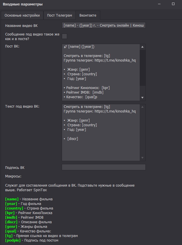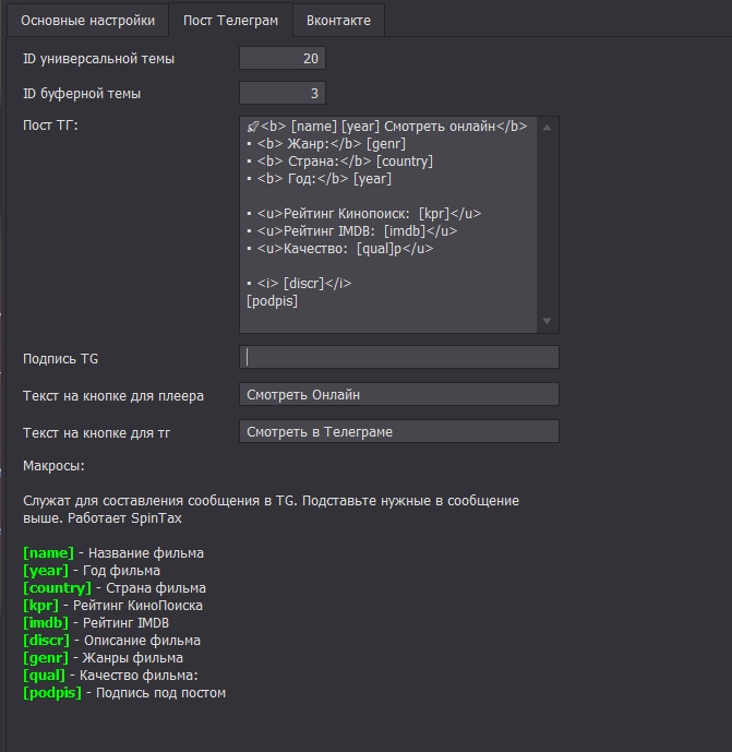 Все, что вам нужно сделать – это следовать инструкциям по настройке и настроить параметры, согласно вашим предпочтениям. И иногда добавлять ID фильмов из кинопоиска в список для постинга.