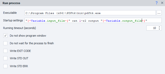 A new challenge emerged in the form of extra pages and metadata within the files. Specifically, PDF files often contained an additional page attributing credits to external websites, which had to be removed. To accomplish this task, I used ZennoPoster's "Run the program" cube to seamlessly integrate third-party CLI tools. This enabled the automated execution of these tools.