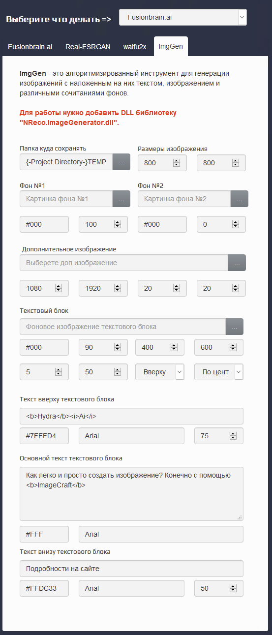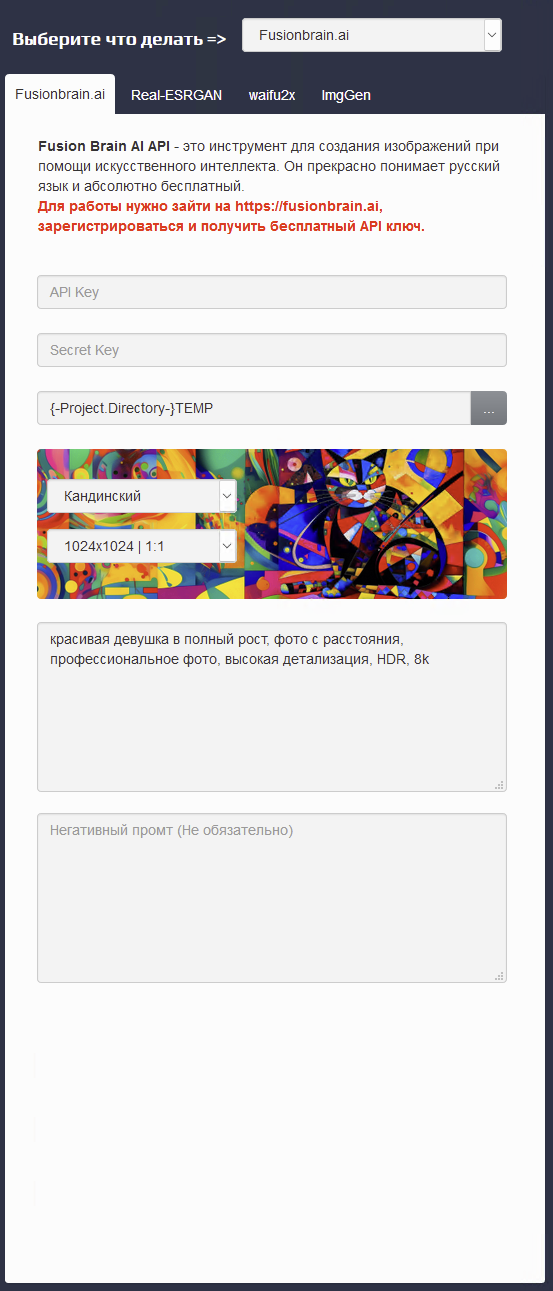 Так же в папке есть мини проект ImageCraft_Tools.zp, в нем простые примеры как можно использовать связку Fusionbrain.ai + RealESRGAN + ImageGenerator.