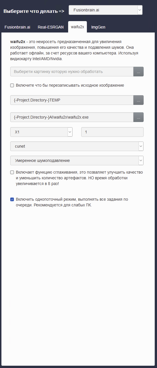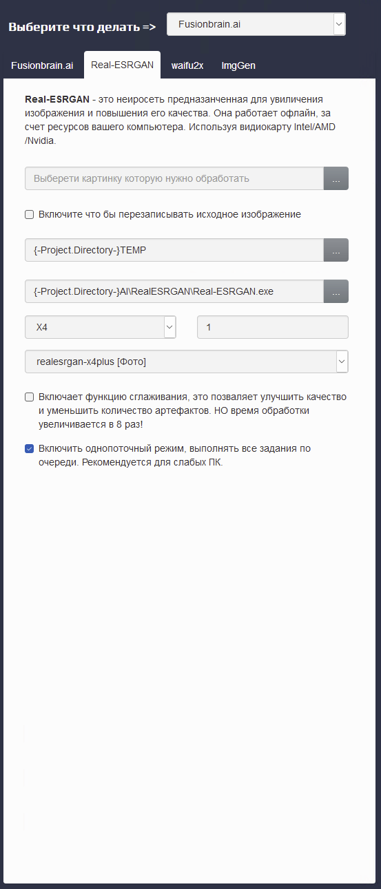 Внутри плагина 4 инструмента: Fusionbrain.ai, RealESRGAN, wifu2x, ImageGenerator