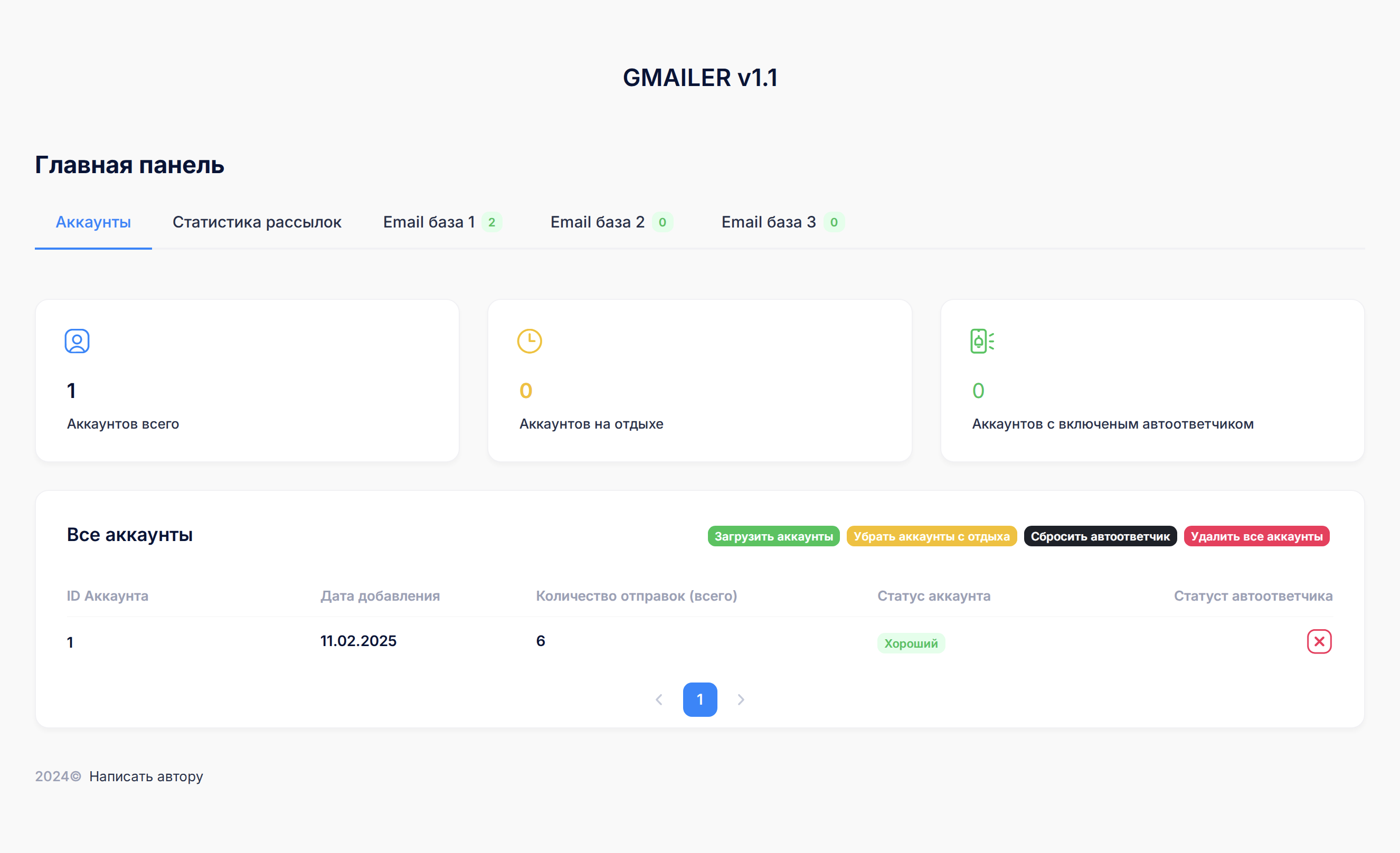 На данной странице мы загружаем аккаунты, удаляем их а также смотрим не большую статистику по ним
