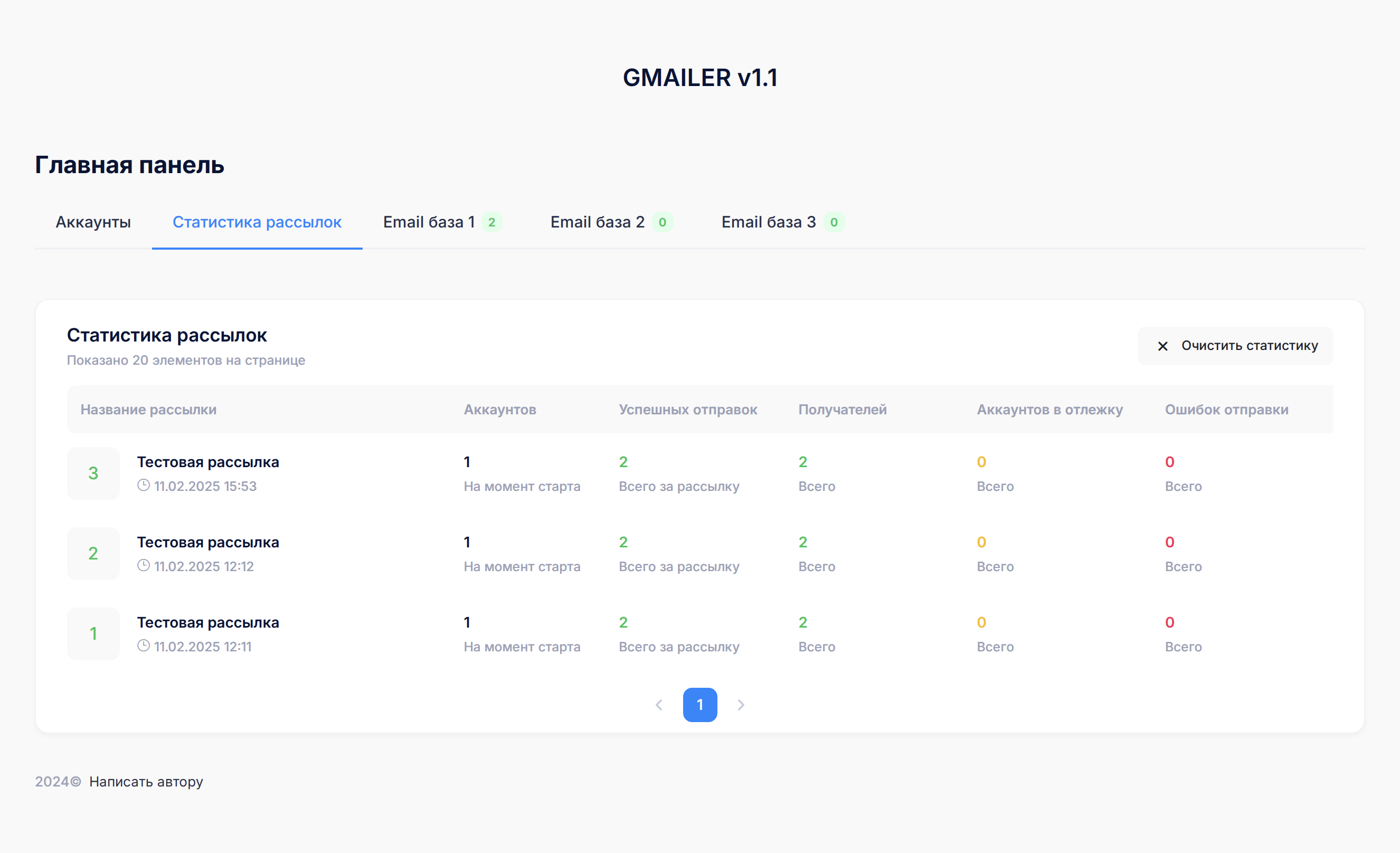 На данной странице можем просматривать статистику ваших рассылок, название рассылок задается в самой программе.
