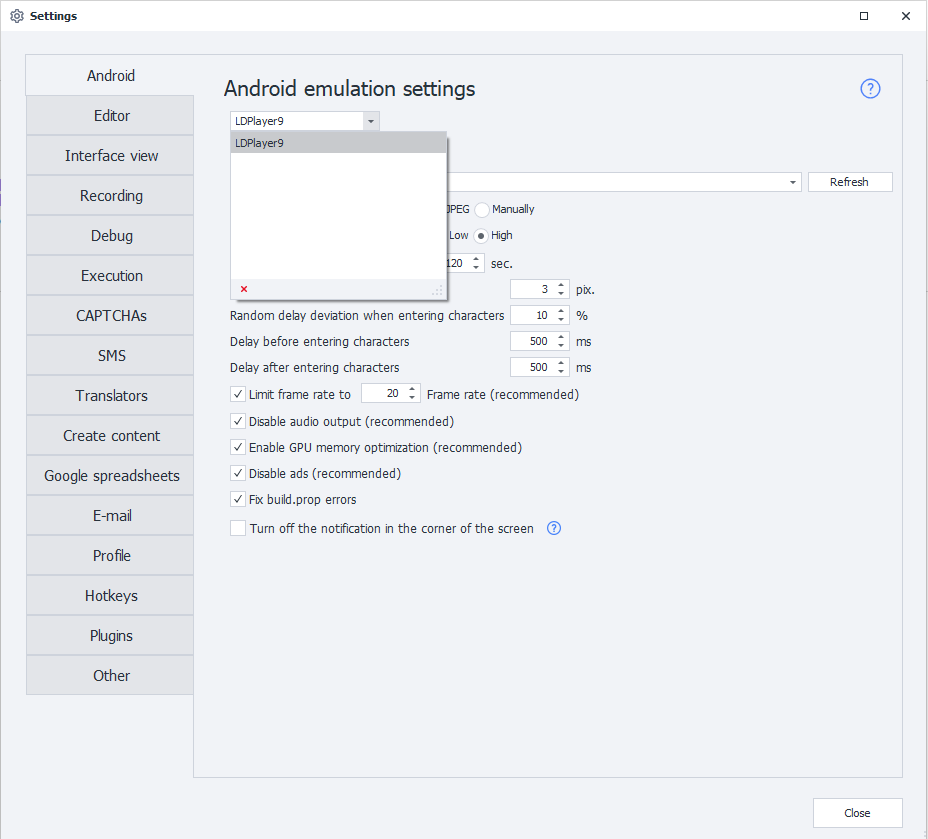 However, inside Android Emulation Settings in ZennoDroid, only LDPlayer appears in the dropdown list.