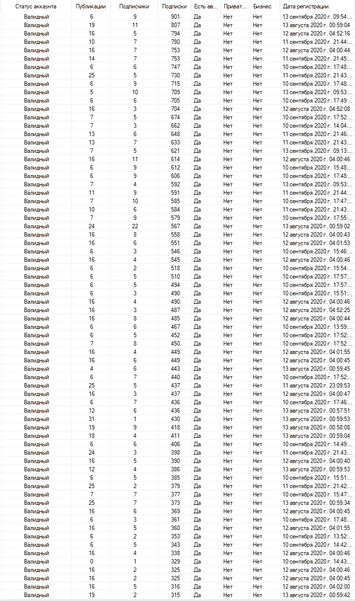 Но если у тебя есть акки, скажем покупные, и ты знаешь, как они среднестатистически себя ведут, на твоих прокси и с твоим софтом - то пробуй акки с этого регера - просто очень советую акуратно регать, тоесть не капец массово, а скажем зарегать 100 штук, НО 1 ру номер - 1 аккаунт. И их запихнуть в свою систему и сказать здесь, как они себя ведут.