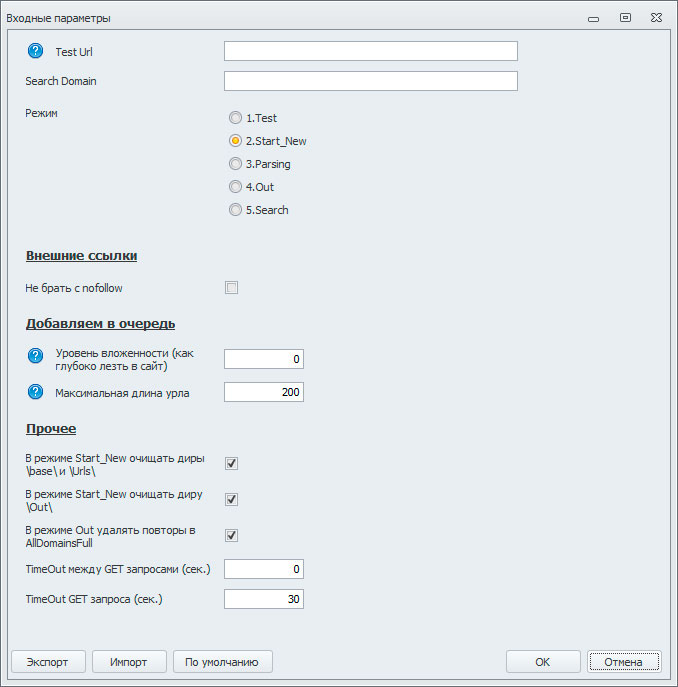 Думаю тут всё понятно и так. Первое поле служит для ввода тестового укла, второе для поиска заданного домена в результатах парсинга. Радиокнопки Mode – выбор режима работы парсера. А ниже идут настройки парсинга.