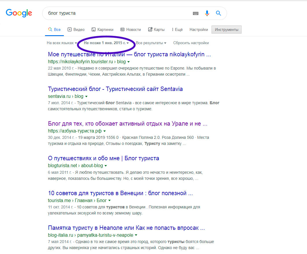 Допустим, мы ищем блоги туристов путешественников. Заходим в гугл. Вбиваем запрос. Что бы было побольше дропов, попросим гугл показать нам выдачу, за несколько лет назад. Дропов в этой выдаче конечно же не будет, но на старых сайтах ссылок на просроченые домены там будет намного больше: