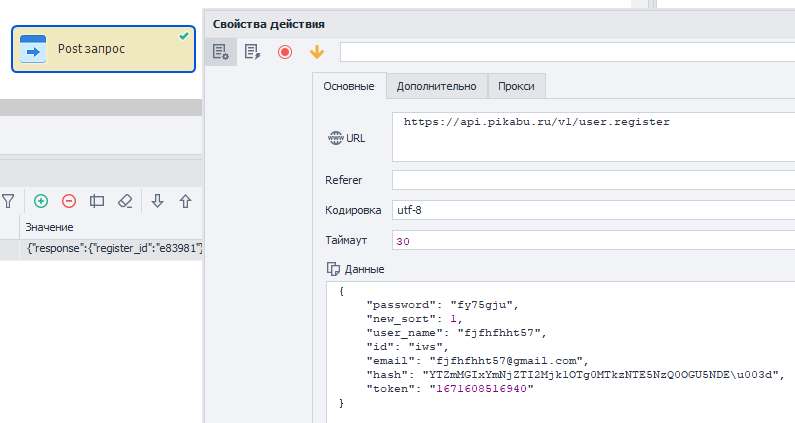 Если скопировать запрос полностью (то есть, ту же почту, логин и т.д.) в зеннопостер, то, вроде бы, всё хорошо, нам пришёл в ответ айди регистрации: