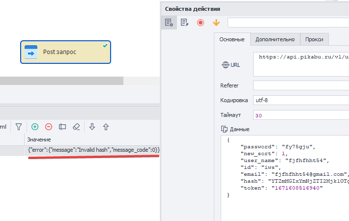 Но если мы поменяем в запросе какие-либо данные, к примеру почту, на которую мы будем регистрировать аккаунт, в ответ на запрос уже придёт ошибка: