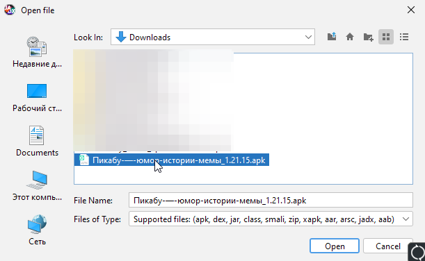 Открываем наш заранее скачанный apk файл Pikabu: