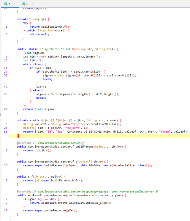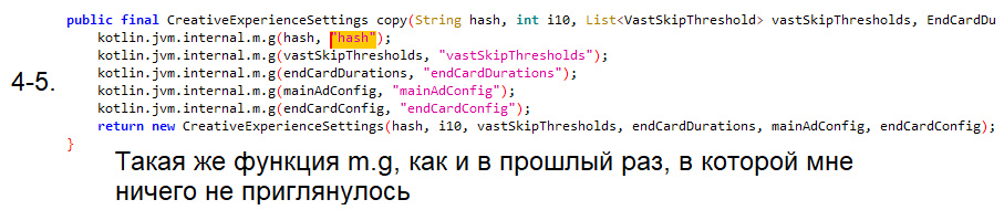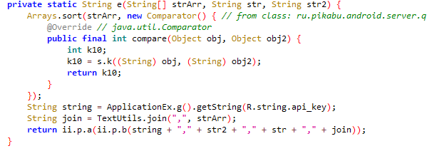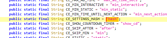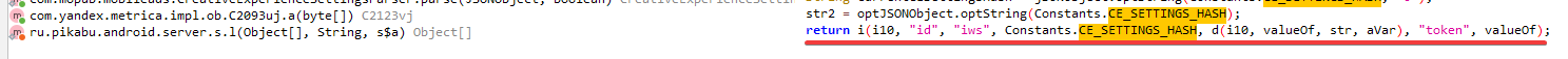 Здесь мне сразу приглянулся данный фрагмент кода, потому что он возвращает какую-то функцию (i), и в её параметрах есть наше ключевое слово (CE_SETTINGS_HASH), и ещё какая-то функция "d", и с ней ещё 4 параметра, возможно, это то что нам нужно. Да и код находится в пакете "ru.pikabu.android.server.s":