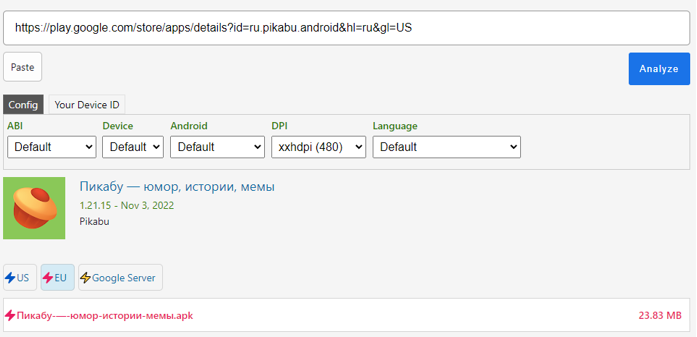 Переходим на сайт https://apk.support/apk-downloader, копируем ссылку нашего приложения из Google Play и нажимаем кнопку Analyze, далее снизу будут сборки под конкретный регион, я выбрал EU: