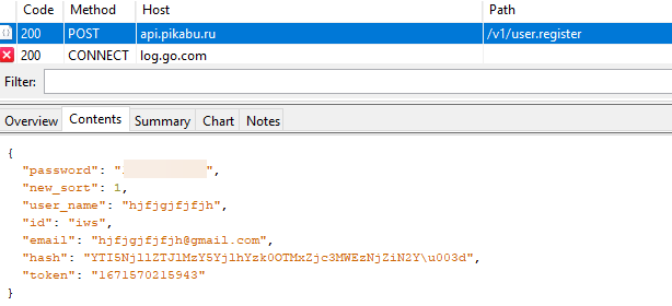 Сейчас попробуем зарегистрировать аккаунт в приложении. Смотрим наш запрос в сниффере: