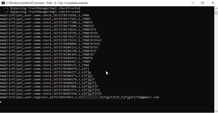 Помимо работы первого нашего скрипты (для снятия ssl pinning), у нас в логе появляются новые строки, именно их на входе получает хукнутая нами функция.