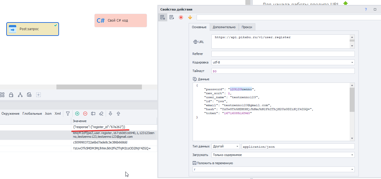 В запросе изменим почту на "testzenno123@gmail.com", логин на "testzenno123", а пароль сделаем "123123zenno". Итого у нас получается входная строка хэша вида "kmq4!2cPl)peZ,user.register,1671608516940,1,123123zenno,testzenno123,testzenno123@gmail.com".