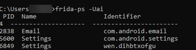 Откроем новое окно консоли (Именно новое!) и проверим, написав команду frida-ps -Uai: