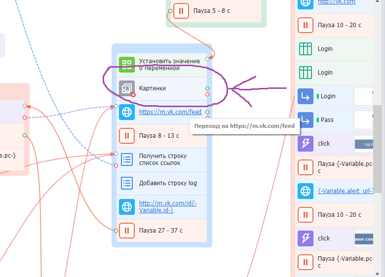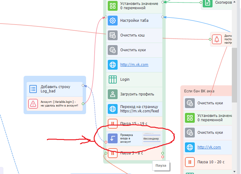 Так же бывает Vk блочит аки, поэтому добавил кубик проверки входа в аккаунт. Соответственно, если проверка не проходит, значит уходим по красной ветке, добавляем инфу в лог, что с акком проблема и переходим на другой акк. …