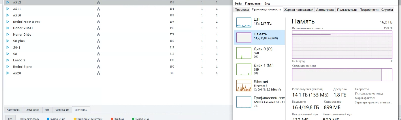 Есть 25-40% процессора и до 14 Гб оперативки , и нагрузка на оперативную память постепенно увеличивается ..... Работает всего нечего 12 мобилок. После 12 часов непрерывной работы начинаются подвисания