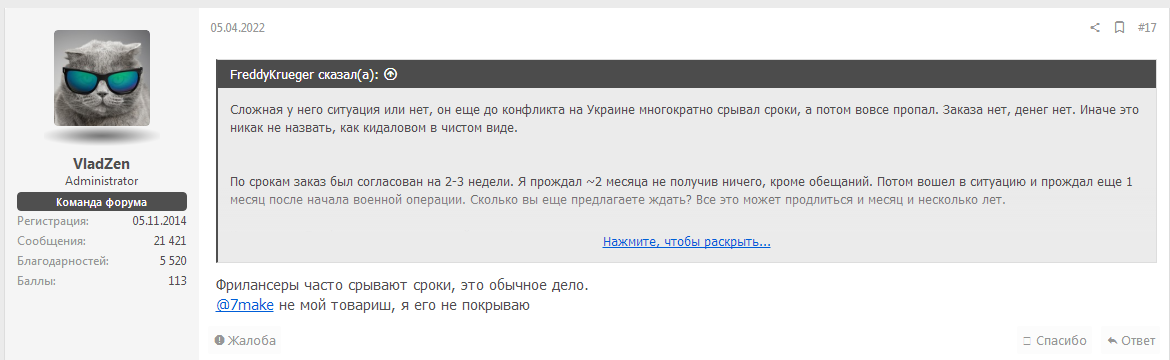 Время прошло, под шумок все забыли, проехали. Модератор кинул людей на 3000$, но ничего страшного. По словам админов - это нормальная ситуация. У человека сложности, и задержка заказа это в порядке вещей.