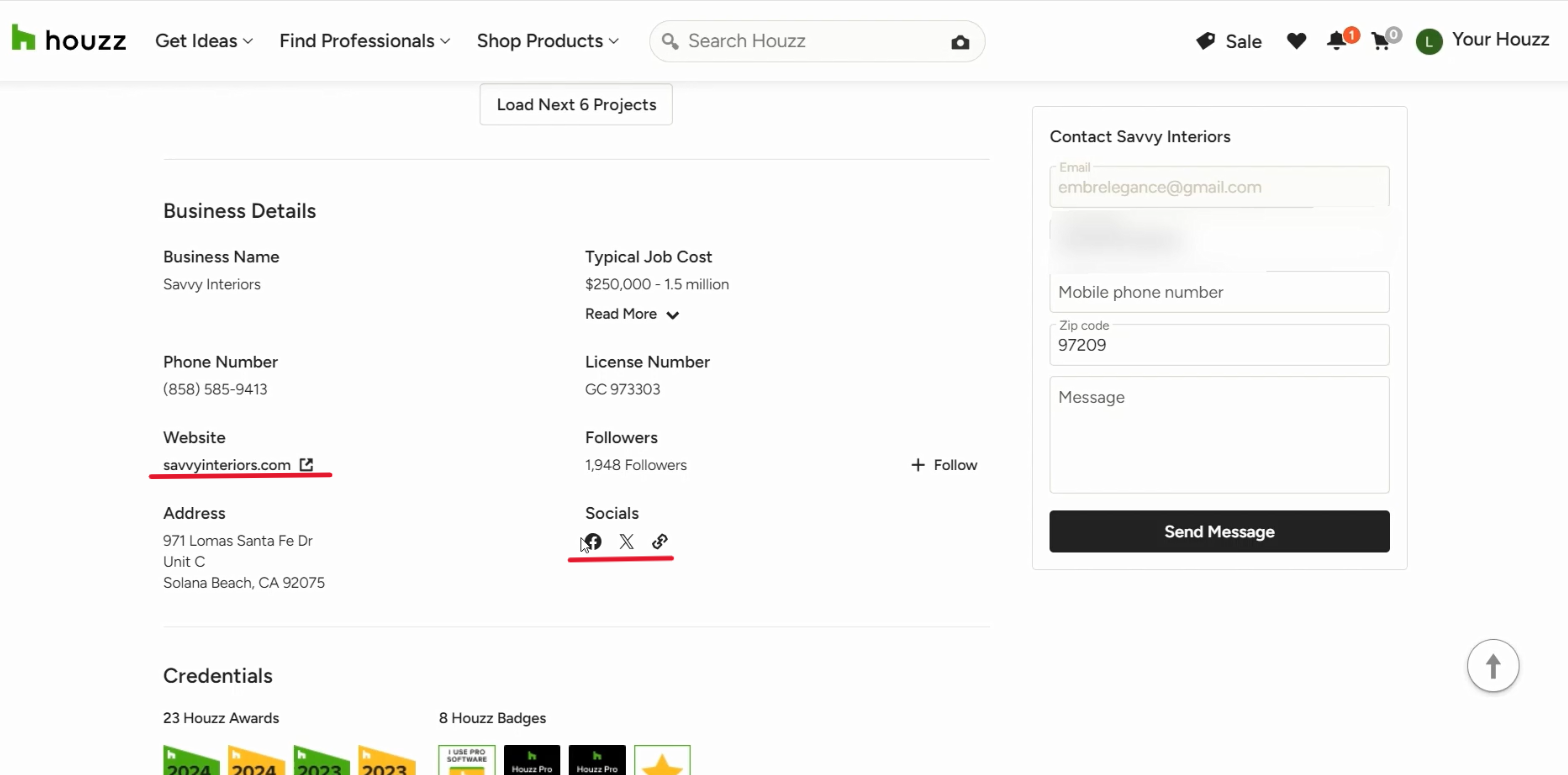 Несмотря на неудачу с формами обратной связи, я не собирался останавливаться. В процессе сбора информации я заметил, что многие дизайнеры интерьеров на Houzz оставляют ссылки на свои сайты. Это открывало новые возможности для продвижения.
