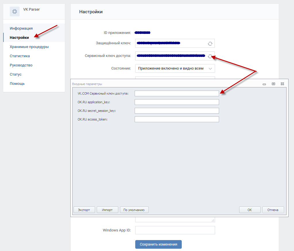 Переходим в настройки приложения и копируем Сервисный ключ доступа во входные настройки.