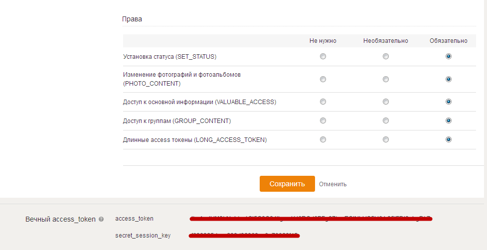 В настройках приложения, в самом низу, есть кнопка для получения вечного токена. Нажимаем ее и копируем secret_session_key и access_token во входные настройки.
