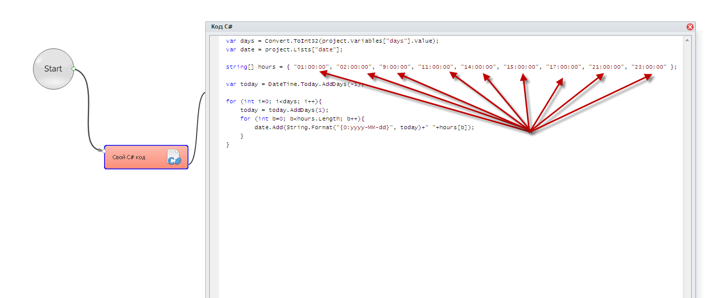 5. Открываем шаблон timetable_generator.xmlz на редактирование. И в массиве hours задаем свое время для отложенного постинга. Это время размещения постов на протяжении дня. Достаточно просто отредактировать существующие значения или добавить свои через запятую. Количество дней для генерации дат задаем во входных настройках.