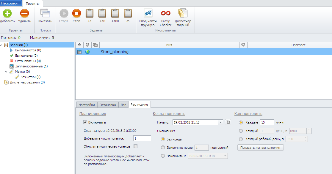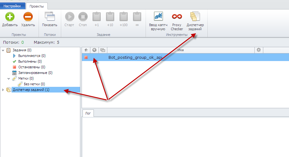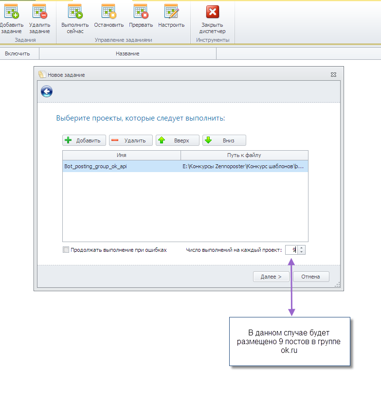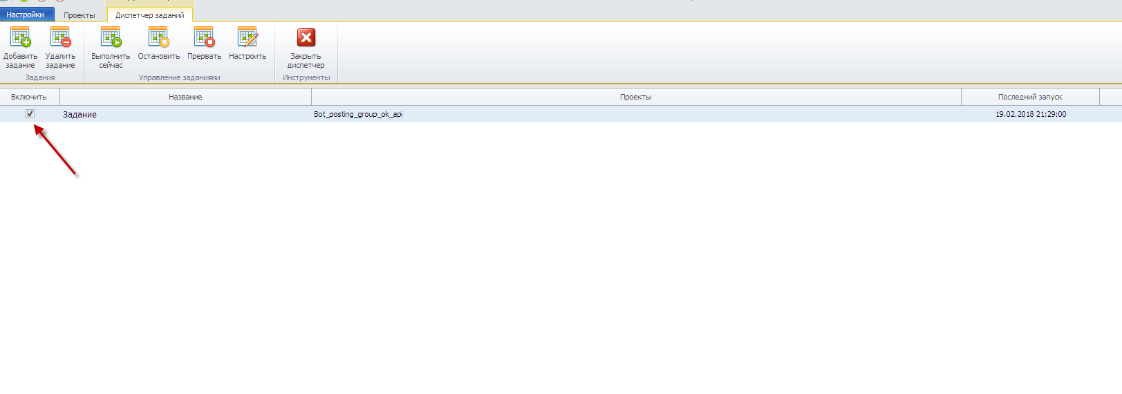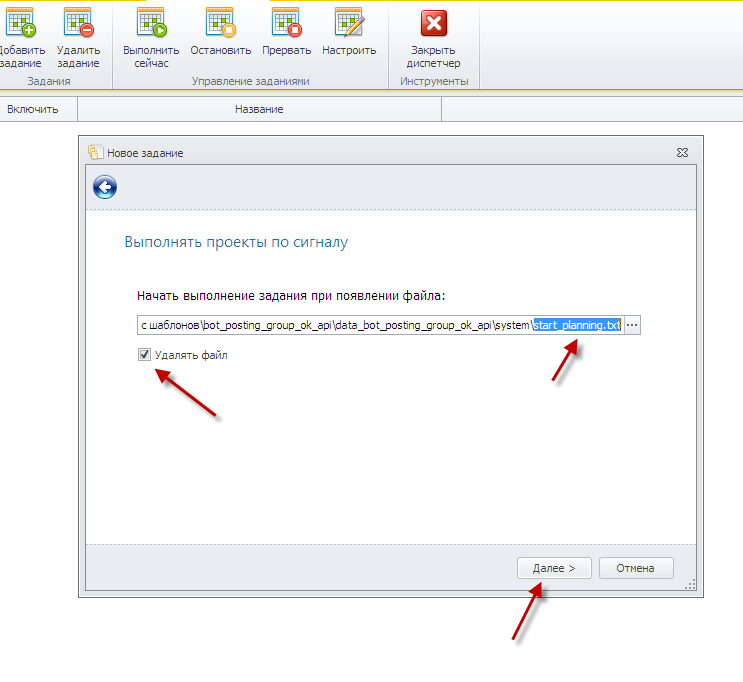3. Запускаем шаблон bot_posting_group_ok_api.xmlz в работу через диспетчер задач по сигналу. В нашем случае сигналом есть появления файла start_planning.txt созданный шаблоном start_planning.xmlz